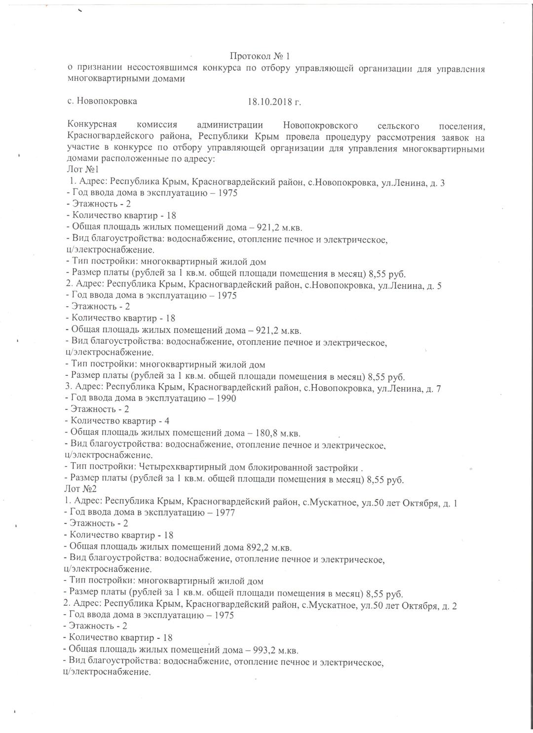 Протокол №1 о признании несостоявшимся конкурса по отбору управляющей организации для управления многоквартирными домами от 18.10.2018г.